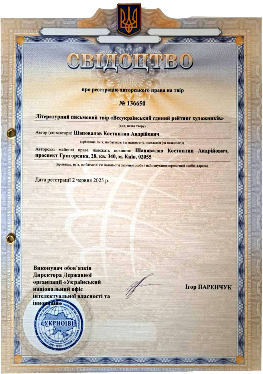 Документи » КОНСТИТУЦІЯ УКРАЇНИ» Закон України Про професійних творчих працівників та творчі спілки» Про порядок надання статусу національних всеукраїнським творчим спілкам» Указ ПРЕЗИДЕНТА УКРАЇНИ Про День художника» Статут Національної спілки художників України» Положення про об’єднання молодих художників і мистецтвознавців НСХУ» Єдиний професійний рейтинг художників України» Свідотство про реєстрацію авторського права на Літературний письмовий твір “Всеукраїнський єдиний рейтинг художників”